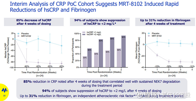 - 概念验证部分效果突出:在针对高CVD(Cardiovascular Disease,心血管疾病)风险受试者的扩展研究中,40mg剂量治疗4周后,hsCRP持续降低85%,94%的受试者hsCRP水平降至<2 mg/L(心血管风险升高的阈值),同时纤维蛋白原降低31%。