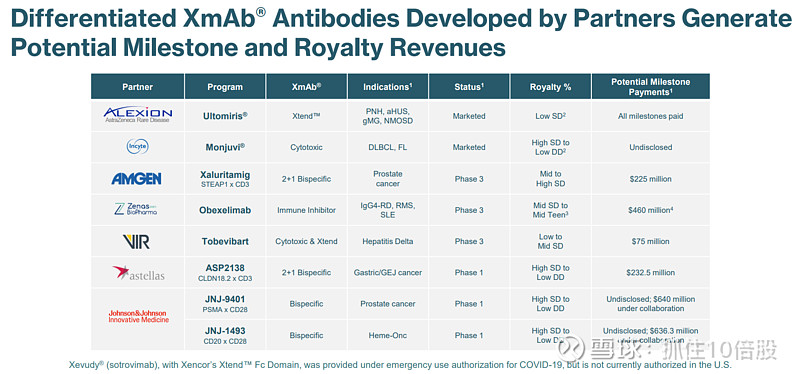 公司的合作管线是其价值和风险缓冲的重要组成。多个合作伙伴项目已进入后期开发或上市阶段,持续产生里程碑收入并验证XmAb平台: