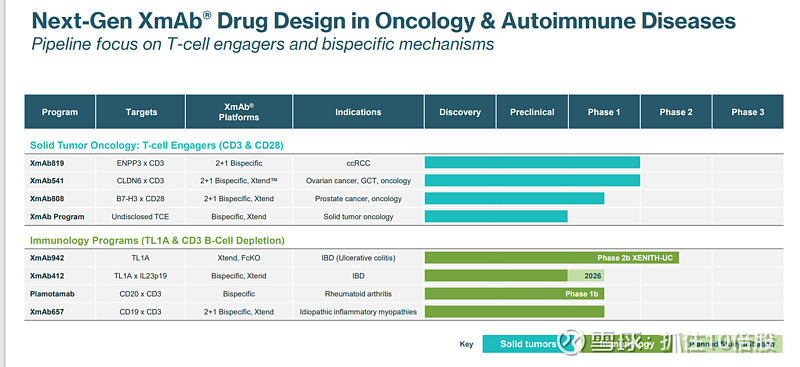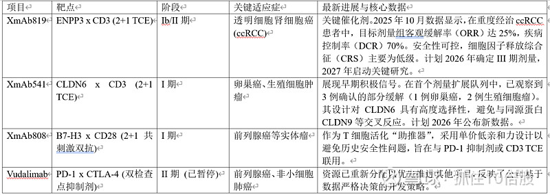 公司已重新平衡其研发管线,专注于最能发挥其工程优势的领域,特别是实体瘤中的T细胞衔接器(TCE)和自身免疫疾病中的双抗疗法。截至2026年初,其管线呈现多点突破的态势。
