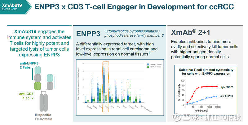 ENPP3是一种在肾细胞癌中高表达而在正常组织中低表达的靶点,具有良好的肿瘤特异性。其在肾脏原发肿瘤中的基因表达显著高于其他器官。XmAb® 2+1技术增强了抗体对高抗原密度肿瘤细胞的结合能力,提高选择性杀伤效率,同时减少对正常细胞的影响。其对高ENPP3表达细胞的细胞毒性显著上升,而对低表达细胞影响较小,体现其靶向性强、安全性高的特点。