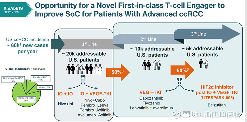 美国每年约有6万例新发ccRCC病例,其中约2万名患者可接受一线治疗,主要方案包括免疫疗法联合(IO+IO)或免疫联合抗血管生成药物(IO+VEGF-TKI)。约50%患者进展至二线治疗,约1万名患者可接受VEGF-TKI类药物如卡博替尼、替沃扎尼布等。进一步50%进入三线治疗,约5千名患者可使用HIF2α抑制剂如Belzutifan。全球ccRCC中70%为透明细胞型,是主要研究对象。XmAb819作为新型靶向药物,有望改善现有治疗标准(SoC),尤其在后续治疗线中展现潜力。