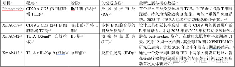这是Xencor近年来重点拓展的领域,旨在利用T细胞衔接器(TCE)深度耗竭致病性B细胞,或靶向上游关键炎症因子。