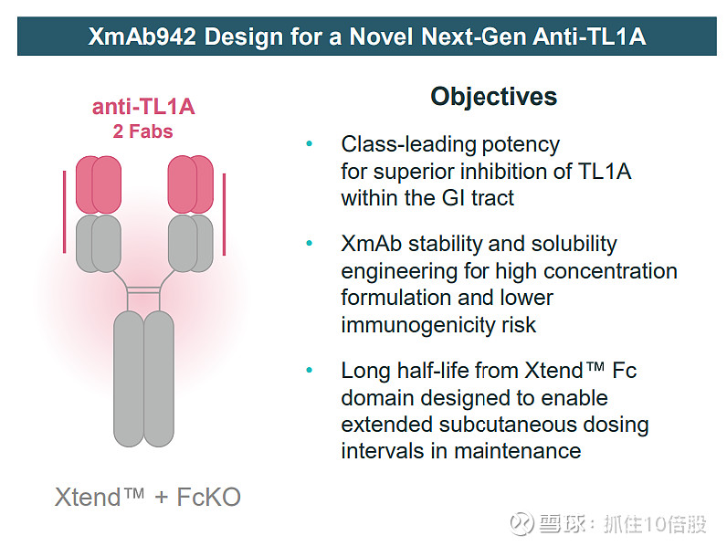 XmAb942采用双Fab片段结合抗TL1A靶点,具有高亲和力和特异性。其设计亮点包括: