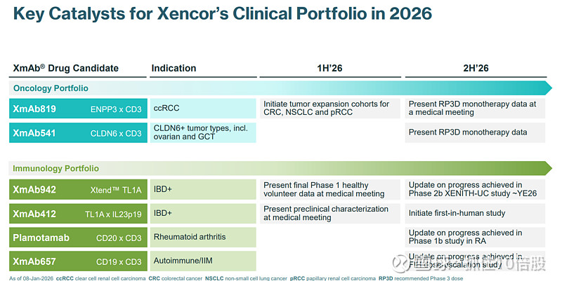 在肿瘤学领域,XmAb819(ENPP3 x CD3)针对ccRCC,计划在2026年上半年启动肿瘤扩展队列研究,下半年展示RP3D单药治疗数据;XmAb541(CLDN6 x CD3)用于CLDN6阳性肿瘤,包括卵巢癌和GCT,同样计划在下半年展示相关数据。