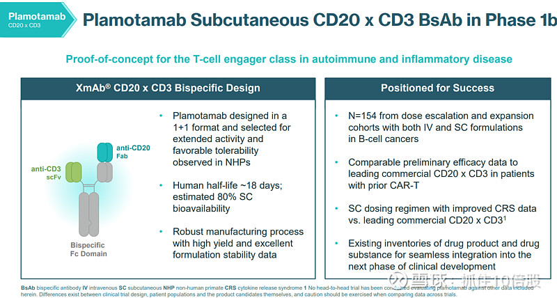 lamotamab是一种靶向CD20和CD3的双特异性抗体,用于治疗B细胞相关疾病。Plamotamab采用1+1格式设计,结合抗CD20 Fab与抗CD3 scFv片段,具有较长的半衰期(约18天)和良好的皮下生物利用度(约80%),适用于皮下给药。其Fc域增强稳定性,生产工艺成熟,产量高且制剂稳定。临床Ib期试验纳入154例患者,涵盖静脉与皮下给药方式,初步疗效与现有同类药物相当,尤其在已接受CAR-T治疗的患者中表现良好。皮下给药方案还显示出更优的细胞因子释放综合征(CRS)控制能力。此外,已有充足的药物库存支持下一阶段临床开发。