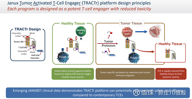 传统的双特异性T细胞衔接器(TCE)疗法在血液癌症中有显著抗肿瘤活性,但用于治疗实体瘤存在局限,如免疫系统过度激活致细胞因子释放综合征(CRS)、对健康组织的靶向毒性及药代动力学(PK)不佳致半衰期短。Janux利用平台掩蔽技术设计新型候选药物,以克服传统TCE在毒性和疗效方面的局限。其TRACTrs和TRACIrs旨在增强肿瘤特异性激活并优化药代动力学,提高安全性、给药方式及疗效。