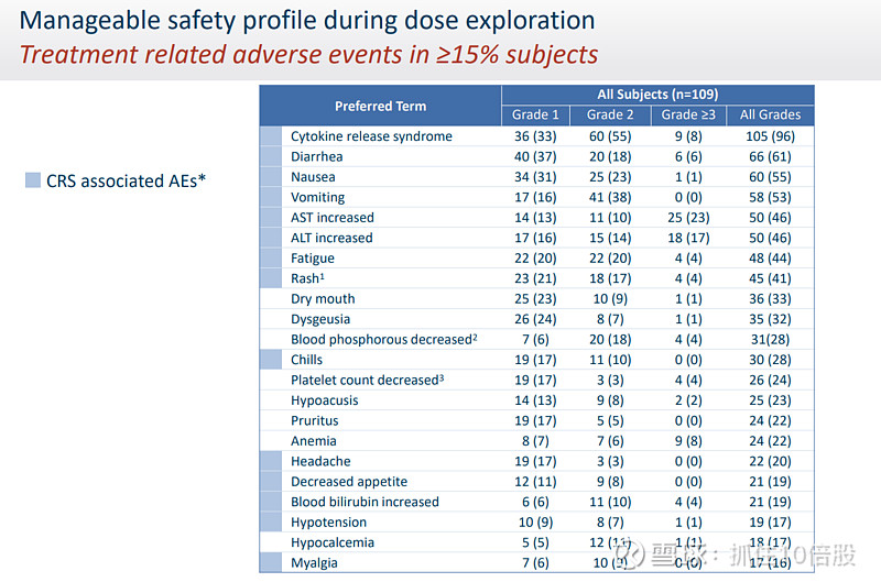 安全性:大多数不良事件为1-2级,CRS可控,但几乎所有患者都出现了CRS。