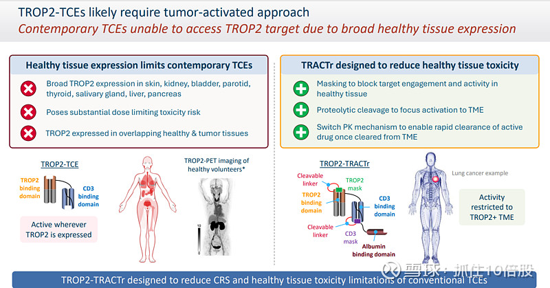 TROP2 是经过验证的高价值肿瘤靶点,但其在多种健康组织中的广泛表达,使传统 TCE 或 ADC 疗法面临严重的剂量限制性毒性。Janux 的 TRACTr 技术通过肿瘤激活设计,为 安全靶向 TROP2 提供了全新路径。