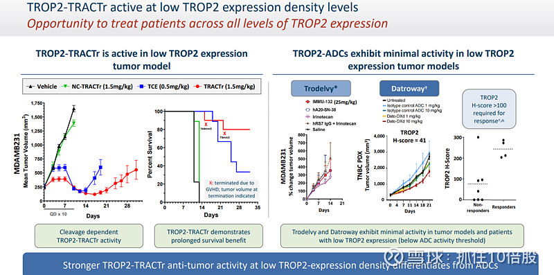 覆盖更广患者群:临床前数据显示,TROP2-TRACTr 在低 TROP2 表达的肿瘤模型中仍具活性,而 TROP2-ADC 在此类患者中疗效有限。