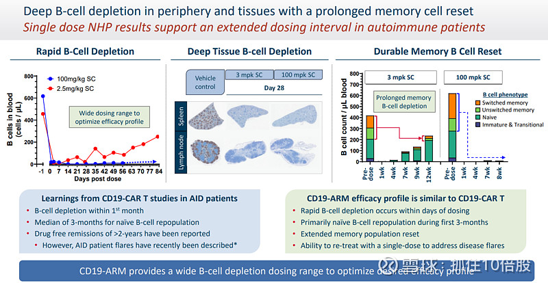CD19-ARM 旨在模拟 CD19 CAR-T 疗法在自身免疫病中诱导的深度 B 细胞耗竭与长期无药缓解疗效,但其作为一种 “现货型”、可皮下注射、可重复给药的药物,在可及性、便利性和成本上具有革命性优势。