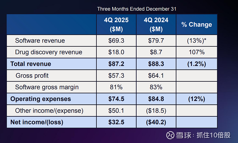 四季度公司总营收8720万美元,软件营收6930万美元出现阶段性下降,看似业绩承压,但实则是软件业务从传统本地部署向托管模式转型带来的收入确认规则变化,并非业务需求萎缩,且药物发现业务的持续增长弥补了部分缺口,业务结构进一步优化。