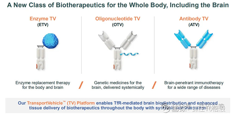 血脑屏障(BBB)在维持大脑微环境以及保护大脑免受血液中有害物质和病原体侵害方面至关重要。长期以来,血脑屏障给中枢神经系统疾病的药物研发带来了巨大挑战,因为它会阻止大多数药物以治疗相关浓度到达大脑。Denali 公司的 TransportVehicle™(TV)平台是一项专有技术,旨在通过静脉给药后穿越血脑屏障,将抗体、酶和寡核苷酸等大型治疗性分子有效递送至全身,包括大脑。该 TV 平台基于经过工程改造的 Fc 结构域,这些结构域可与血脑屏障上表达的特定天然转运受体结合,如转铁蛋白受体和 CD98 重链氨基酸转运体,并通过受体介导的胞吞作用将 TV 及其治疗性货物递送至大脑。在动物模型中,经 TV 平台工程改造的抗体和酶,其脑部暴露量比未采用该技术的同类抗体和酶高出 10 至 30 倍以上。经 TV 平台工程改造的寡核苷酸,在灵长类动物中的脑部暴露量比未采用该技术的全身递送寡核苷酸高出 1000 倍以上。脑部暴露量的提升和广泛分布,可通过使候选药物达到治疗相关浓度的范围并广泛分布,从而提高治疗效果。TV 平台已完成临床验证,目前有五个基于 TV 技术的项目处于临床研发阶段。