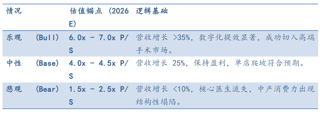 重要性:医疗服务是典型的“重资产+慢周转”。如果增长率低于20%,市场会将其视为传统的“诊所股”而非“成长股”,估值倍数会从4xP/S直接下修至1.5x-2x。
