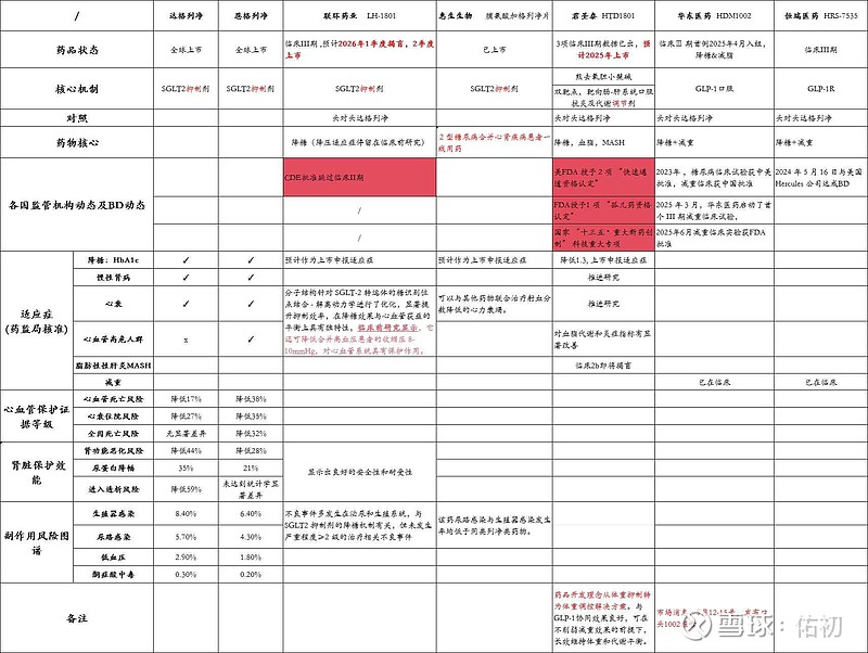 $联环药业(SH600513)$ 更新下市场上头对头达格列净的药物情况,表中所有药物都已经到临床3期。目前头对头达格列净的药物有四款,联环药业的LH-1801,$君圣泰医药-B(02511)$ 的HTD-1801,华东医药的口服GLP-1药物HDMA1002, 恒瑞医药的GLP-1R药物HRS-7353。