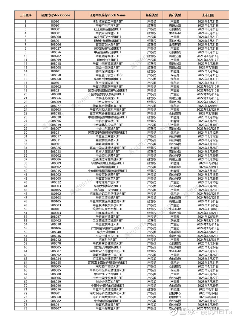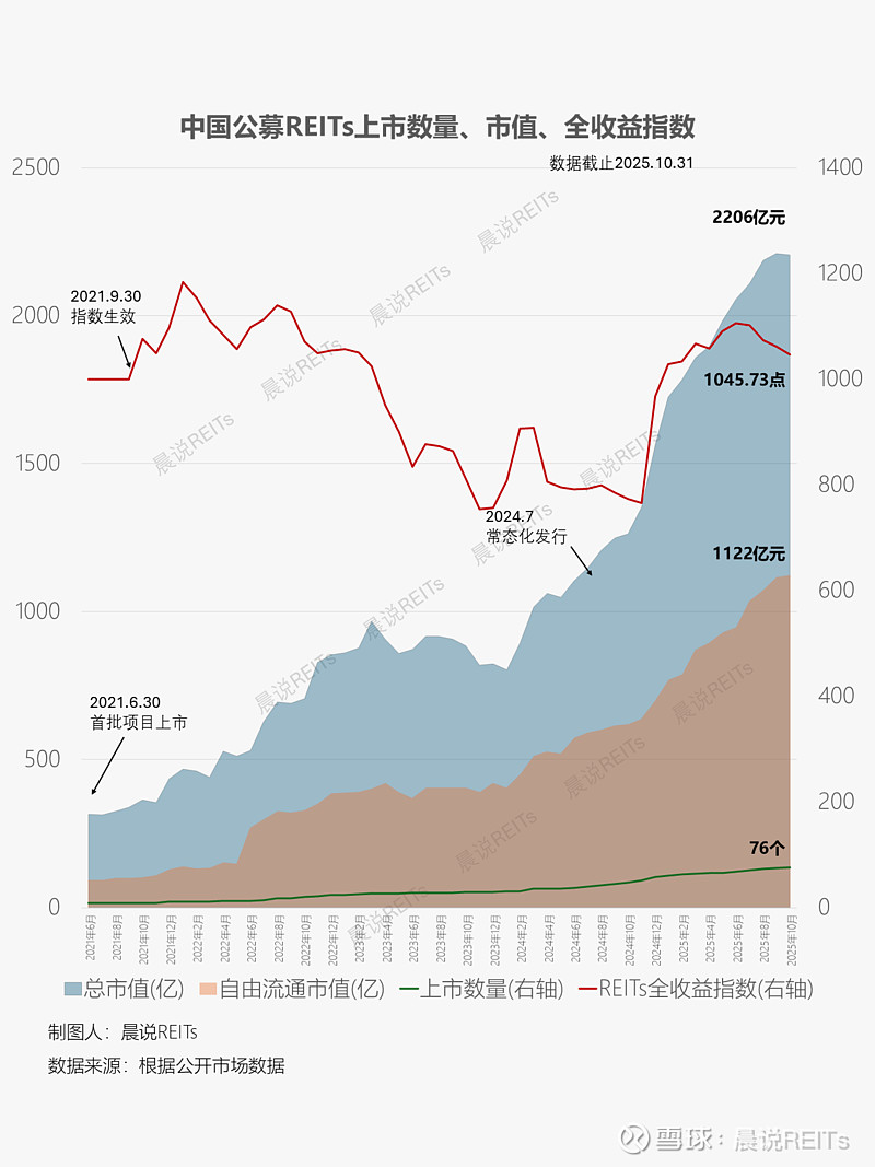 3、截止2025年10月31日,中证REITs全收益指数收于1046点,上月1061点,环比-1.4%。中证REITs总市值2206亿元,自由流通市值1122亿元。本月新上市1只华夏中海商业REIT,累计已上市数量76只。