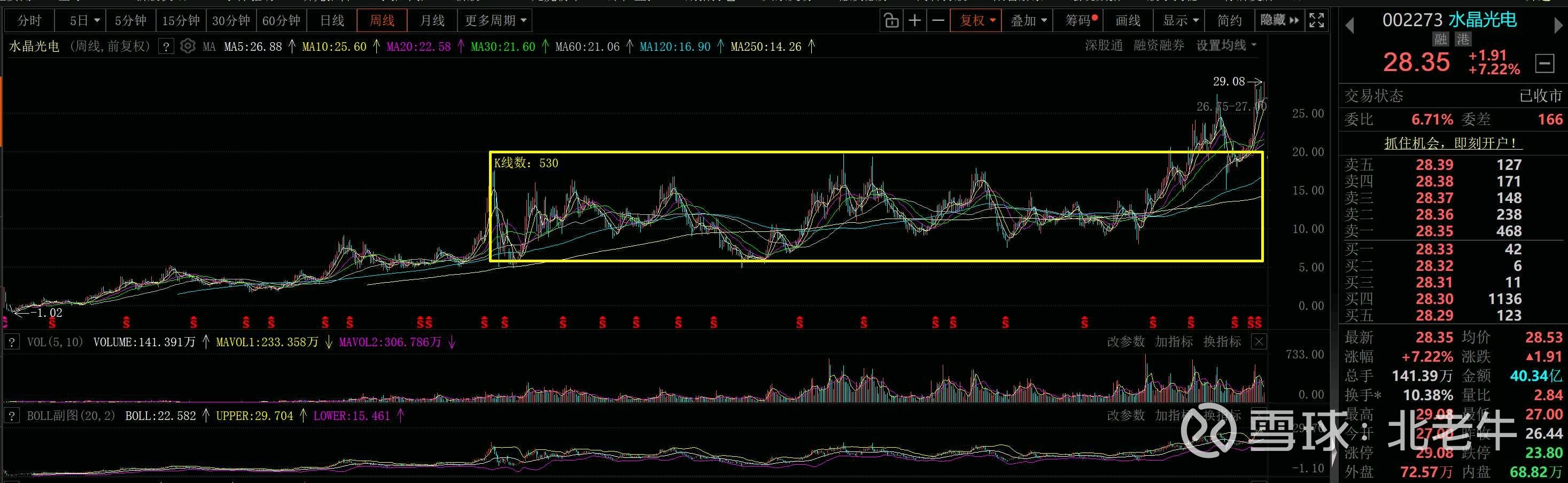 水晶的股性很稳,涨停板很少见,今天应该是今年第二次触及涨停,虽然炸板,但收盘历史新高,值得庆祝!