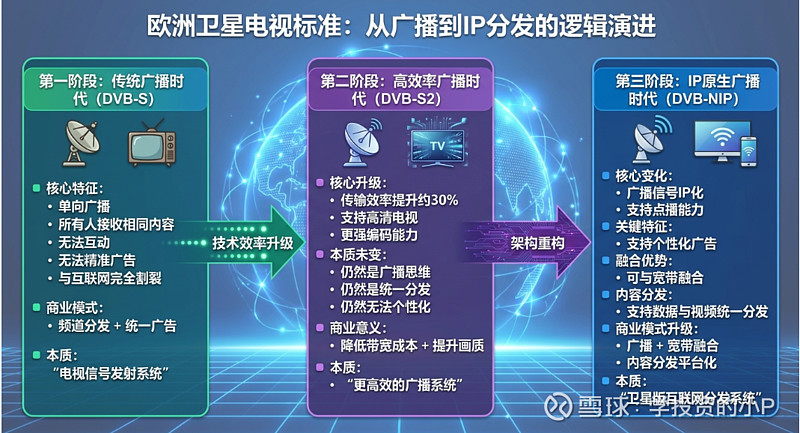 欧洲卫星电视长期采用 DVB 标准体系:DVB-S、DVB-S2。上一轮 DVB-S → DVB-S2 的升级曾带来数千万终端替换,是一次典型的行业级更新周期。而这一次的 DVB-NIP,性质更加深刻。它的本质是:让卫星广播从传统“广播模式”升级为IP原生架构。(用下面这张图让大家加以理解)