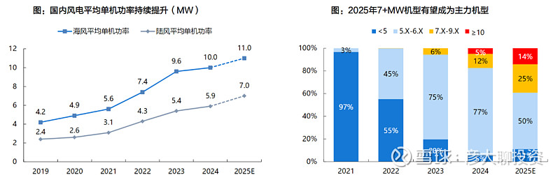 而展望十五五,需求则有显著加速增长预期。前几日,行业备受关注的北京风能展发布了《风能北京宣言2.0》,其中提及:“十五五”期间,国内风电年新增装 机容量不低于120GW,其中海风年新增装机容量不低于15GW,确保2030年中国风电累计装机容量达1300GW,到2035年累计装机不少于2000GW,到2060年 累计装机达5000GW。对比2021-2024年国内风电年均新增装机60GW,其中海风年均新增装机8GW,可以说,十五五期间风电年均新增装机规模相比均有望 实现翻倍以上增长。虽然该宣言并不一定等于实际的硬性目标,但从十四五的实际完成情况看,有一点可以确定,那就是十五五期间的风电需求相比十四五会有明显的增长。