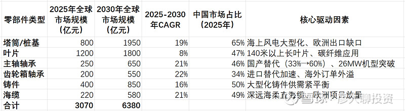 接下来,来看看风电轴承这一细分领域未来的增长逻辑。根据市场统计,风电零部件板块的未来市场规模如下表所示,其中,轴承行业具有技术壁垒高、增速快以及国产替代空间大的特点。