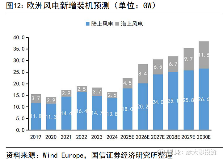 好巧不巧,2025年海外风电市场同样有明显的好转之势。从2025年开始,得益于欧洲等地区国家政策上的不断发力,海外风电市场同样有加速发展的态势,根据券商统计,2025年1-8月,大陆以外地区海风开工建设规模均已经超过2024年全年,并且欧洲地区实现翻倍左右增长,市场预计2026年大陆以外地区海风装机有望达 到10GW以上,实现大幅增长。此外,根据全球风能理事会预计,未来十年(2025–2034年)欧洲海上风电累计新增将达到126GW,年均12GW,而过去五年的年均装机仅有3GW,是历史水平的四倍。也就是说,十五五期间在需求端,风电行业会迎来海内外需求的共振。
