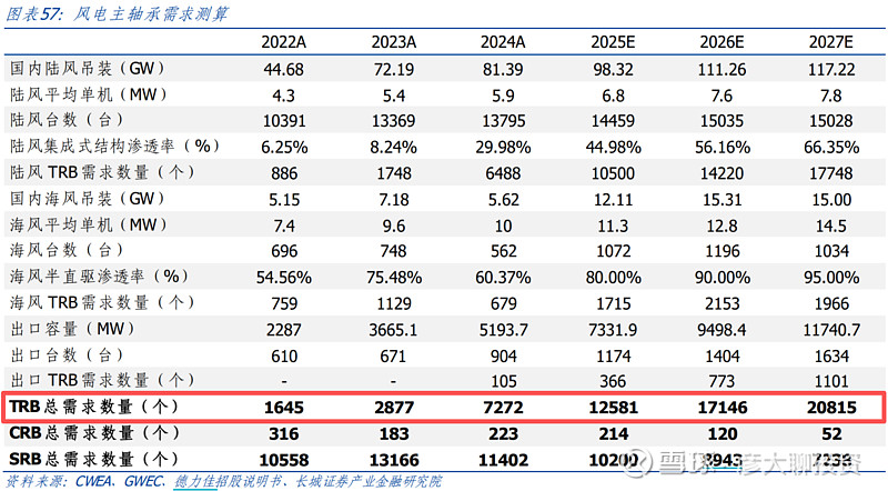 3)技术革新带来双重α逻辑,根据调研信息显示,风机传动链技术在经历了多年的进化之后,有一个很明确的趋势就是从三点支撑向前集成转变,过多的技术理论就不再展开,感兴趣的可以去看看长城证券的研报以及风能产业网、北极星风力发电网等网站查看相关技术上的解读。总之,这一技术变化是风机企业综合了经济效益、可靠性、后期可维护性等多个方面因素之后带来的,在调研里面,这一趋势得到了行业分析师、业内专家以及企业端高管的一致认同,且这一变化已经开始反映在了新强联等企业的报表上,这点之后再予以分析。因此,上述技术变化的趋势可以说已经毋庸置疑,那么这一变化导致的结果是TRB轴承对于SRB轴承的取代,以前一个风机可能只需要一个TRB轴承,而技术变革之后一个风机现在需要两个TRB轴承,单机的需求量直接翻倍,且还有一个重要的变化趋势是,今年以来,这种技术的渗透正在从大兆瓦机型向5-6兆瓦的中型机型渗透,再加上本身风电的发展就一直有大型化的趋势,现在5兆瓦以下机型的占比越来越小(如下图所示),这意味着TRB轴承的潜在市场规模正在快速变大,其增长的速率远超风电行业其他的细分领域,α逻辑不断增强。比如,在券商的测算中,2026年TRB轴承的需求量几乎是2024年的2倍还多。
