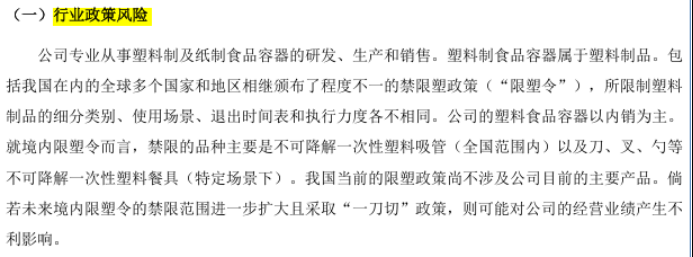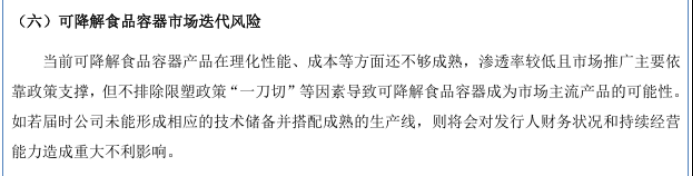 而在“可降解食品容器市场迭代风险”中也明确提到:,但不排除限塑政策“一刀切”等因素导致可降解食品容器成为市场主流产品的可能性。如若届时公司未能形成相应的技术储备并搭配成熟的生产线,则将会对发行人财务状况和持续经营能力造成重大不利影响。