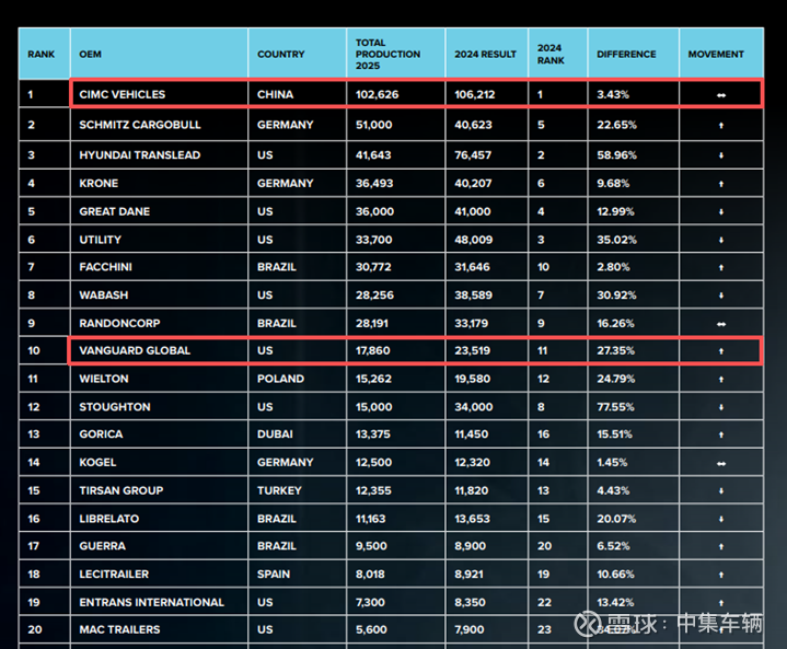值得一提的是,中集车辆旗下Vanguard Global凭借其深耕北美市场的本土化运营能力和灵活可靠的供应链体系,成功跻身全球前十,进一步彰显了中集车辆集团在全球主流市场多元化品牌战略与跨洋协同运营的成功之道。