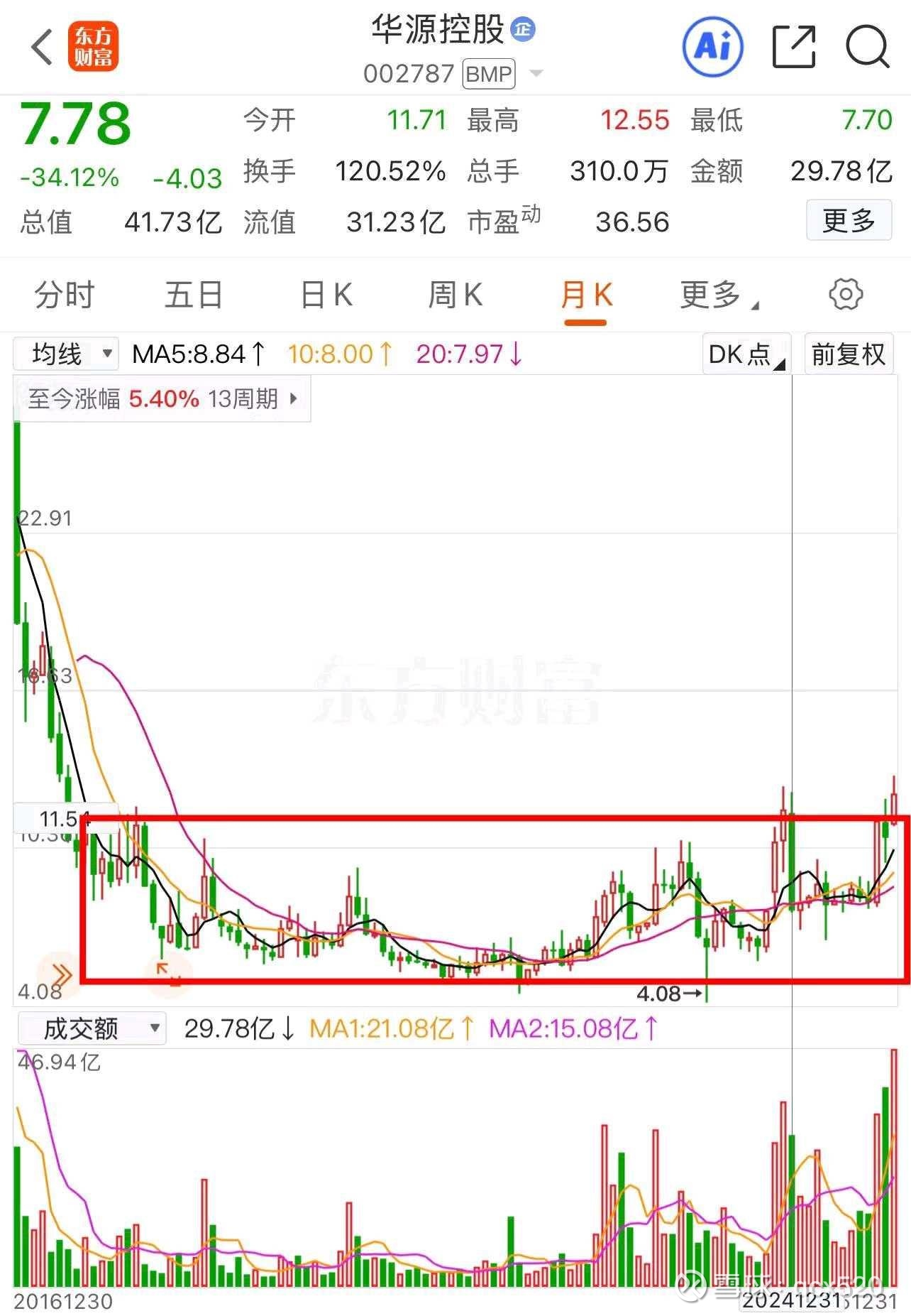 2025年12月,华源控股的月K线,已经有效站上了2018年1月至今整整八年的箱体上沿。