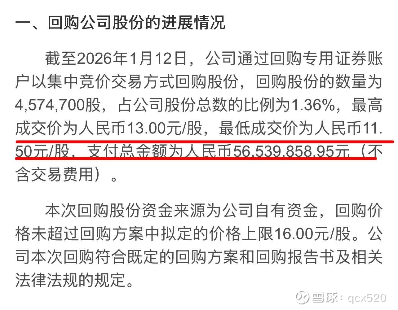 截至1月12日,公司累计回购股份4,574,700股,占总股本1.36%,累计投入资金约5,653.99万元,已非常接近本轮回购上限6,000万元。公告中公司仍明确表示“将根据市场情况继续实施回购方案”,这在实务中通常意味着本轮回购将以接近上限完成。考虑到当前时间点已是1月13日,不排除在近日盘中完成剩余回购,并在本周内披露回购完成公告。