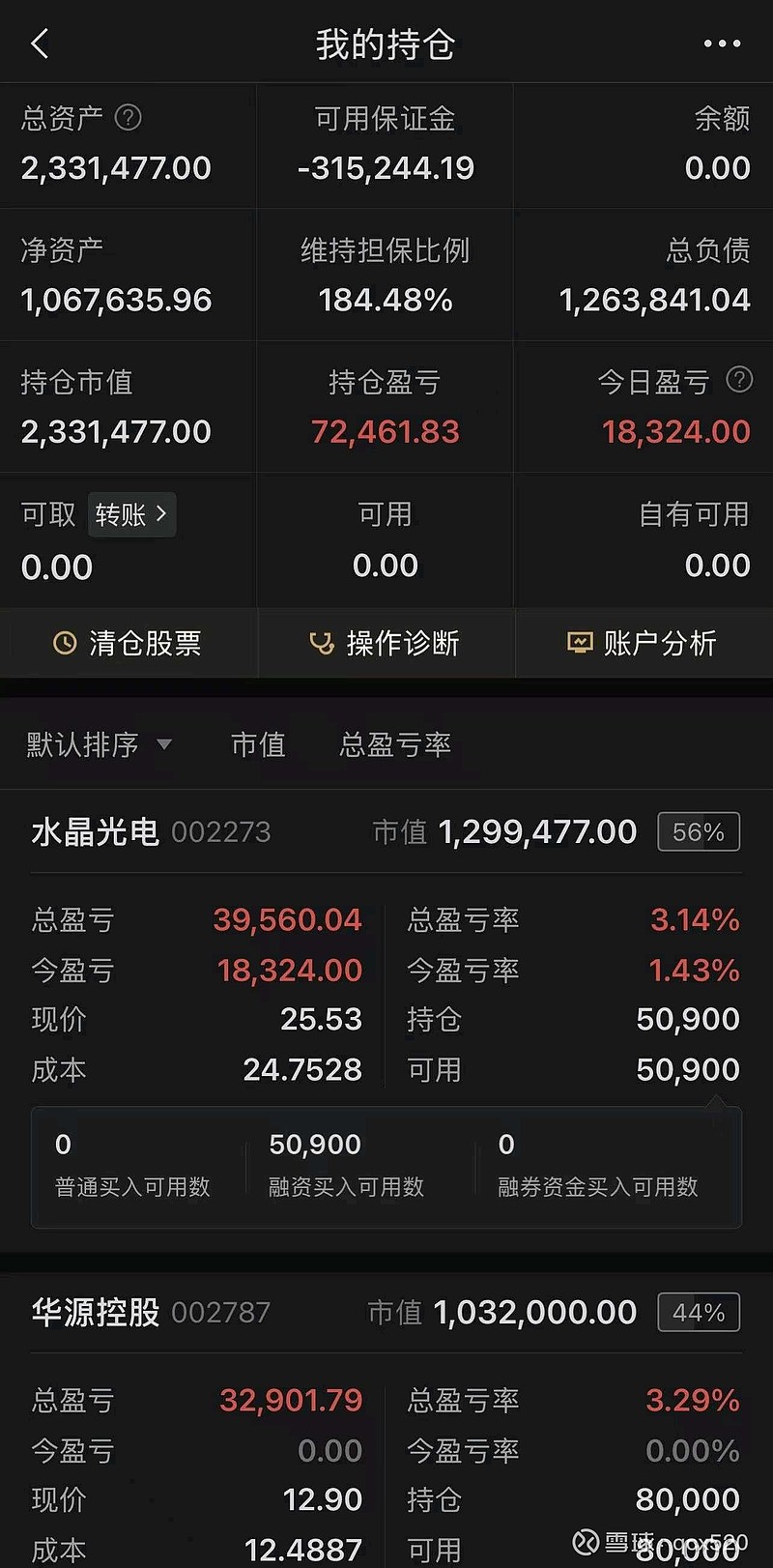 持股说明:经过近两日市场的剧烈波动,002787华源控股和002273水晶光电有相当一部分投资者因为恐慌而卖出股票,这在牛市中是好事,筹码经过充分交换后后面的上涨盘面会更轻。一轮牛市下来,最终绝大多数投资者会亏损的根本原因是:牛市中因为恐惧而频繁交易,牛市未因为贪婪而没有逃顶。现在是牛市中我选择坚定持股。