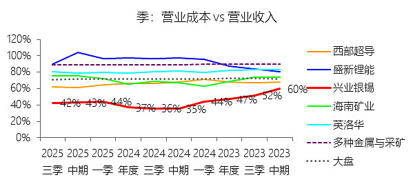 营业成本:2025年前三季,兴业银锡的营业成本为17.36亿元,同比增长47.56%,与营业收入的比例为42.35%(营业成本率,即1-毛利率),同比上升6.66个百分点;2015-2024年(十年),此项合计为91.74亿元,平均比例为45.57%,比多种金属与采矿行业的均值低42.91个百分点,长期呈下降趋势。