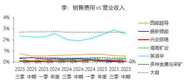 销售费用:2025年前三季,兴业银锡的销售费用为0.03亿元,同比增长14.48%,与营业收入的比例为0.08%(销售费用率),同比持平;2015-2024年(十年),此项合计为0.39亿元,平均比例为0.19%,比多种金属与采矿行业的均值低0.47个百分点,长期呈下降趋势。