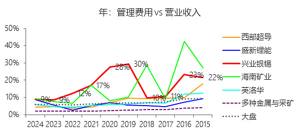 管理费用:2025年前三季,兴业银锡的管理费用为2.55亿元,同比增长9.73%,与营业收入的比例为6.22%(管理费用率),同比下降0.83个百分点;2015-2024年(十年),此项合计为26.54亿元,平均比例为13.18%,比多种金属与采矿行业的均值高10.81个百分点,长期呈下降趋势。
