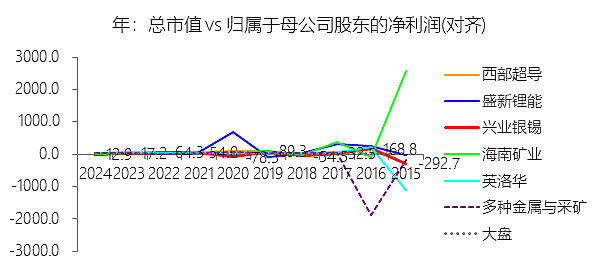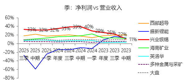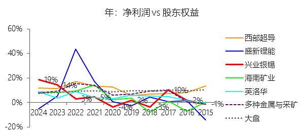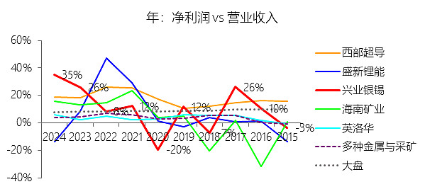 营业收入增长率:2025年前三季,兴业银锡的营业收入为40.99亿元,同比增长24.36%,增速同比下降11.6个百分点;2015-2024年(九年)增长414.68%,年复合增长19.97%,比多种金属与采矿行业的复合增速高3.87个百分点,长期呈下降趋势。增速短期下降主要由于核心子公司银漫矿业在报告期内受采区停产(2025年3月9日停产,4月16日复产)等因素影响,导致除银、铅、锌外的部分主力矿产品产量同比下滑,其中矿产锡产量减少13.12%、矿产铜减少18.83%、矿产铁减少16.42%,虽然本期并购宇邦矿业85%股权纳入合并报表带来了营收增量,但上述主力矿种的减产在一定程度上抵消了增长潜力,导致营收增速较上年同期的高基数有所回落。增速长期下降主要由于随着公司营收规模基数的不断扩大,维持早期因核心资产注入及投产所带来的超高速增长的边际难度递增,同时受控股股东重整及部分年度(如2019年)因安全事故导致停产整改等历史因素扰动,使得长期平均增速曲线在经历爆发期后逐渐趋于平缓。增速高于多种金属与采矿行业的复合增速主要由于公司拥有国内稀缺的优质银锡资源,特别是银漫矿业作为国内最大的白银生产矿山之一,资源品位高且盈利能力强,加之公司积极推进外延式并购战略,通过收购宇邦矿业、大西洋锡业等优质资产不断增厚资源储量,使得公司在银、锡等特定金属价格长周期向好的背景下,能够实现优于行业平均水平的成长性。
