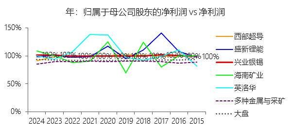 归属于母公司股东的净利润:2025年前三季,兴业银锡的归属于母公司股东的净利润为13.64亿元,同比增长4.94%,与净利润的比例为100.77%,同比下降0.77个百分点;2015-2024年(十年),此项合计为32.93亿元,平均比例为101.72%,比多种金属与采矿行业的均值高12.23个百分点,长期呈上升趋势。比例短期下降主要由于报告期内公司通过并购将宇邦矿业、大西洋锡业等子公司纳入合并报表范围,而这些子公司存在部分非全资控股的情况(如宇邦矿业持股比例为85%),导致少数股东损益由去年同期的负值转为正值或亏损收窄,从而在会计层面上微幅稀释了归母净利润占净利润的比重。比例长期上升主要由于公司在2015-2024年间经历了深刻的业务重组与股权结构优化,通过剥离亏损的非矿山资产并持续增持核心优质矿山股权,使得公司盈利来源更加向母公司控股的优质主体集中,且在行业低谷期,公司部分非全资子公司出现经营性亏损导致少数股东权益冲抵了整体亏损,客观上推高了归母净利润的账面比例。比例高于多种金属与采矿行业的均值主要由于公司核心资产的股权结构高度集中,主力利润贡献矿山(如银漫矿业)多为全资或高比例控股子公司,与行业内普遍存在的复杂合资或多层级持股模式相比,兴业银锡的少数股东权益占比较低,使得公司创造的绝大部分净利润均能直接转化为归母净利润,体现出极强的利润归属集中度。