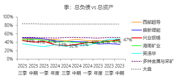 负债率:2025年第三季末,兴业银锡的总负债为76.95亿元,对比年初增长83.95%,与总资产的比例为43.94%(负债率),同比上升12.05个百分点;2015-2024年(十年),此项合计为409.57亿元,平均比例为43.07%,比多种金属与采矿行业的均值低8.47个百分点,长期呈下降趋势。比例短期上升主要由于公司在报告期内为完成对宇邦矿业85%股权和大西洋锡业100%股权的重大跨境并购,新增了大额并购贷款导致长期借款较年初大幅增长182.32% ,同时子公司银漫矿业、乾金达矿业为补充流动资金增加了短期借款 ,加之销售商品预收客户货款激增导致合同负债及其他流动负债分别上升2329.20%和2311.97% ,共同推高了总负债规模与资产负债率。比例长期下降主要由于公司近年来持续加强资本结构管理,通过内生盈利积累不断充实自有资金,并逐步偿还历史债务以降低财务杠杆,同时受控股股东兴业集团长期债务重整影响,公司在长周期内的外延式融资扩张节奏相对克制,促使负债水平在较长时间维度内呈现波动下行趋势。比例低于多种金属与采矿行业的均值主要由于公司主力矿山均为在产成熟矿山,能够产生稳定的经营性现金流用以支持资本开支,对外部债务融资的依赖度相对行业平均水平较低,且公司在重整期间由于融资渠道受限,客观上保持了更为审慎的杠杆水平,从而使得整体资产负债率优于行业均值。