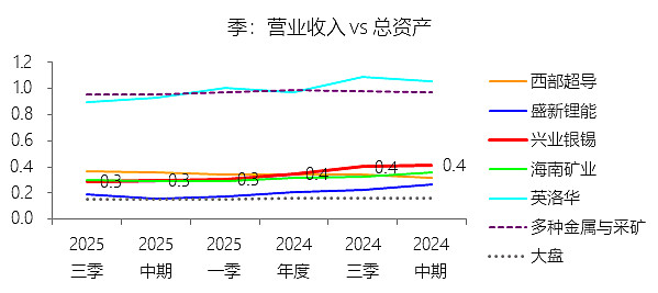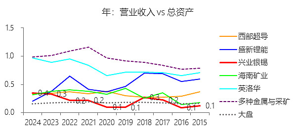 总资产周转率:2025年Q3 TTM,兴业银锡的总资产周转率为0.3次,同比下降0.11次;2015-2024年(十年),平均总资产周转率为0.2次,比多种金属与采矿行业的均值低0.76次,长期呈上升趋势。