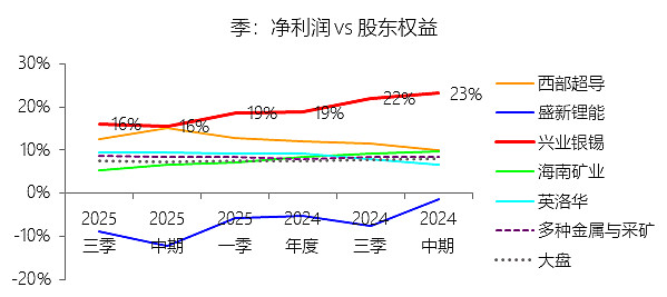 净资产收益率:2025年第三季末,兴业银锡的股东权益为98.19亿元,对比年初增长23.01%,净利润与股东权益的比例为16.05%(TTM净资产收益率),同比下降5.89个百分点;2015-2024年(十年),此项合计为541.28亿元,平均比例为5.98%,比多种金属与采矿行业的均值低3.1个百分点,长期呈上升趋势。