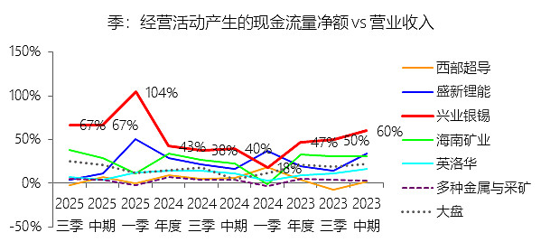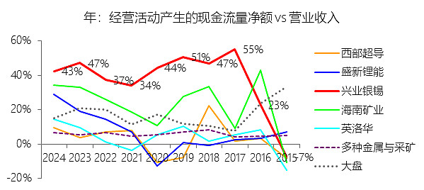 经营活动产生的现金流量净额:2025年前三季,兴业银锡的经营活动产生的现金流量净额为27.42亿元,同比增长118.66%,与营业收入的比例为66.89%,同比上升28.85个百分点;2015-2024年(十年),此项合计为83.41亿元,平均比例为41.43%,比多种金属与采矿行业的均值高35.47个百分点,长期呈上升趋势。比例短期上升主要由于报告期内公司主营矿产品销售收入同比增加,且销售商品收到的现金大幅增长,尤其是预收客户货款增加导致合同负债余额较年初激增2329.20%(增加约8.09亿元),极大提升了经营活动现金流的含金量。比例长期上升主要由于公司通过并购银漫矿业等世界级优质矿山,实现了高毛利品种(如锡、银)的产能跨越式增长,叠加锡、锑等核心金属价格在长周期内中枢上移,且公司持续优化营销策略、加强应收账款回收管理,使得利润向现金的转化效率不断提升。比例高于多种金属与采矿行业的均值主要由于公司拥有的核心矿山资源禀赋极佳,原矿品位显著高于行业平均水平,具备极强的成本竞争力和盈利空间,同时公司作为上游资源型企业在产业链中拥有较强的话语权,采取的预收款模式进一步增厚了经营性现金流,确保了现金流表现长期跑赢行业大盘。