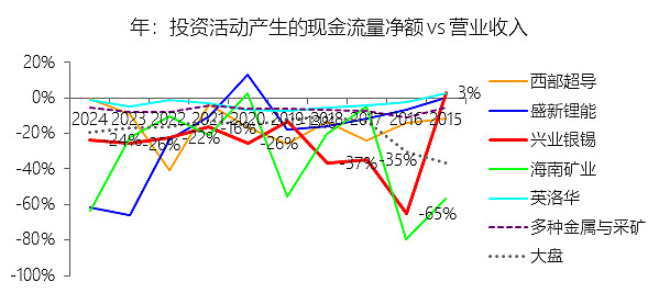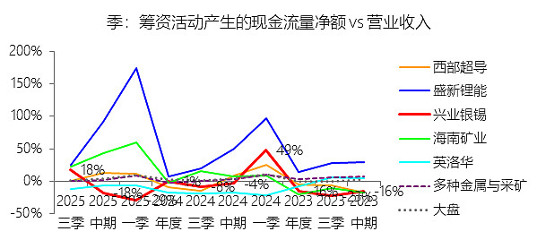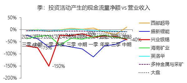 投资活动产生的现金流量净额:2025年前三季,兴业银锡的投资活动产生的现金流量净额为-27.06亿元,绝对值同比增长233.58%,与营业收入的比例为-66.02%,同比下降41.41个百分点;2015-2024年(十年),此项合计为-52.69亿元,平均比例为-26.17%,比多种金属与采矿行业的均值低19.62个百分点,长期呈上升趋势。比例短期下降主要由于报告期内公司实施了重大资源并购战略,为购买宇邦矿业85%股权及大西洋锡业100%股权支付了高达24.82亿元的现金净额,导致投资活动现金流出量同比大幅激增,使得投资活动现金流量净额的绝对值显著上升,进而导致其与营业收入的比例出现大幅下滑。比例长期上升主要由于公司在2015至2024年的十年间,经历了从早期的采选产能大规模建设期向稳产期的过渡,资本性开支在完成阶段性资源整合后曾出现阶段性收缩,且公司通过技术改造提升了现有矿山的生产效率,减少了单位产出的持续性投入需求,使得投资净流出占营收的比例在波动中呈现中枢上行的趋势。比例低于多种金属与采矿行业的均值主要由于公司所处的有色金属行业属于典型的资本密集型行业,而兴业银锡在过去数年间正处于由单一矿山向多金属矿业集群跨越的关键期,频繁的矿权收购、大规模的技改扩建工程以及对深部探矿的持续投入,使得其投资活动现金流出的相对规模长期高于行业平均水平。