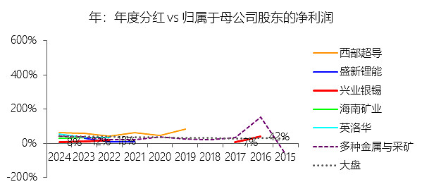 年度分红:2024年,兴业银锡的年度分红为1.24亿元,同比增长4.08%,与归属于母公司股东的净利润的比例为8.12%(分红率),同比下降4.19个百分点;2015-2024年(十年),此项合计为3.50亿元,平均比例为10.62%,比多种金属与采矿行业的均值低19.75个百分点,长期呈下降趋势。比例短期下降主要由于公司在2024年至2025年间正处于资源版图扩张的关键期,为收购宇邦矿业及大西洋锡业等重大资产,公司面临巨大的资本性支出需求及并购贷款偿付压力,在净利润大幅增长的情况下,公司倾向于保留更多留存收益以支持后续的矿山技改与建设,导致分红增速显著滞后于利润增速。比例长期下降主要由于公司在2015-2024年的十年周期内,历经了从重组整合、事故停产整顿到控股股东债务重整的复杂阶段,尤其是在2019年后,为了应对流动性财务危机和安全生产升级投入,公司资金链长期处于紧平衡状态,分红政策被迫向保障经营连续性和偿还债务倾斜。比例低于多种金属与采矿行业的均值主要由于行业内其他矿业公司在成熟期多维持高分红政策,而兴业银锡因拥有银漫、宇邦等处于产能释放前期的世界级矿山,资本开支密度长期高于行业平均水平,且控股股东的债务危机及业绩补偿承诺未履行完毕等历史遗留问题,客观上限制了公司利润分配的空间,使得其现金分红意愿与能力在长周期内均低于行业大盘。