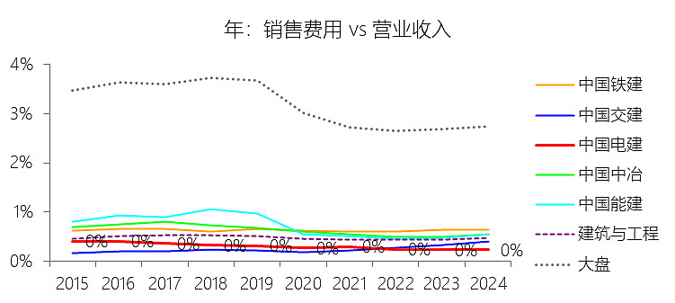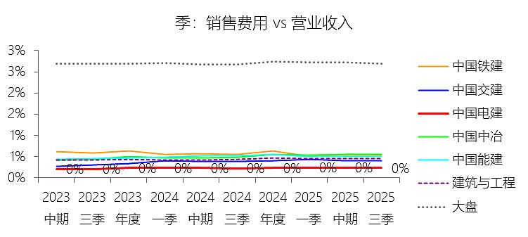 销售费用:2025年前三季,中国电建的销售费用为10.36亿元,同比增长5.15%,与营业收入的比例为0.24%(销售费用率),同比持平;2015-2024年(十年),此项合计为118.24亿元,平均比例为0.29%,比建筑与工程行业的均值低0.19个百分点,长期呈下降趋势。