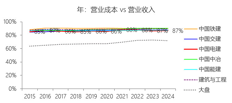 营业成本:2025年前三季,中国电建的营业成本为3886.91亿元,同比增长4.15%,与营业收入的比例为88.52%(营业成本率,即1-毛利率),同比上升0.93个百分点;2015-2024年(十年),此项合计为35873.71亿元,平均比例为86.67%,比建筑与工程行业的均值低2.13个百分点,长期呈上升趋势。比例短期上升主要由于:根据2025年第三季度报告,公司营业成本的同比增速(4.15%)明显高于营业收入的同比增速(3.05%),导致成本支出对收入的侵蚀加剧;这主要源于公司业务规模扩张过程中,大型基建及能源项目在履约高峰期的材料、人工等直接成本投入强度增加,且受行业竞争加剧影响,部分新签EPC项目的利润空间在收入转化阶段有所收窄。比例长期上升主要由于:中国电建在2015-2024年间为追求规模化发展,业务重心逐步从高毛利、低成本占比的“勘测设计咨询”向成本基数较大的“工程承包与勘测设计”一体化转型,特别是施工业务比重的大幅增加推高了整体成本率;同时,公司在2022年剥离了毛利率较高的房地产业务,使得业务结构进一步向成本敏感度更高的基建主业集中。比例低于建筑与工程行业的均值主要由于:公司在水利水电、抽水蓄能及新能源工程领域拥有极高的技术护城河和准入门槛,其“设计引领”的差异化竞争模式相比于传统房建或通用基建企业,在产业链上游拥有更强的议价能力和精细化成本管控空间,从而使成本占比长期维持在行业中下游水平。