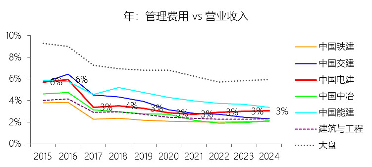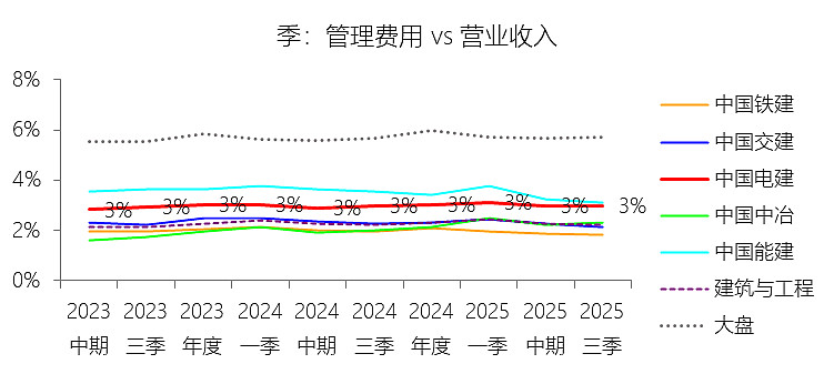 管理费用:2025年前三季,中国电建的管理费用为131.63亿元,同比增长4.03%,与营业收入的比例为3.00%(管理费用率),同比上升0.03个百分点;2015-2024年(十年),此项合计为1383.12亿元,平均比例为3.34%,比建筑与工程行业的均值高0.67个百分点,长期呈下降趋势。