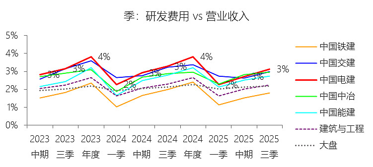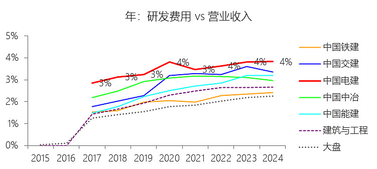 研发费用:2025年前三季,中国电建的研发费用为137.91亿元,同比减少1.45%,与营业收入的比例为3.14%(研发费用率),同比下降0.14个百分点;2015-2024年(十年),此项合计为1312.99亿元,平均比例为3.17%,比建筑与工程行业的均值高1.13个百分点,长期呈上升趋势。