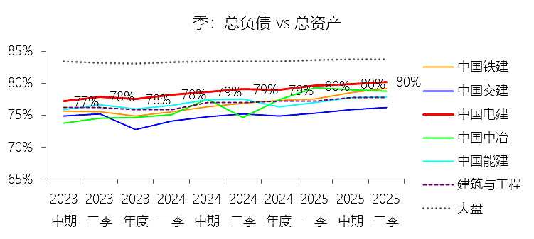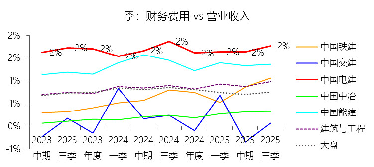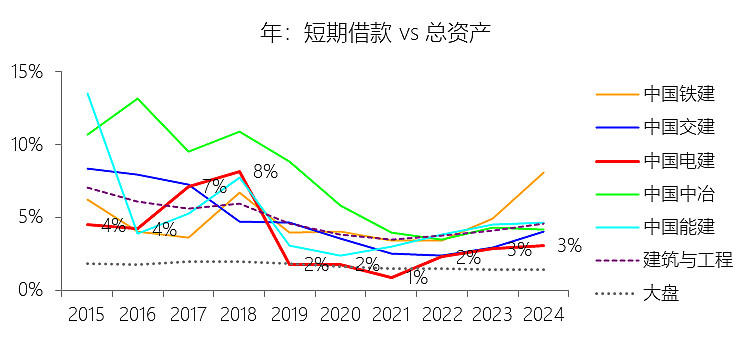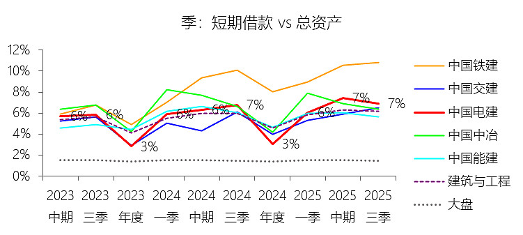 短期借款:2025年第三季末,中国电建的短期借款为971.56亿元,对比年初增长144.71%,与总资产的比例为6.92%,同比上升0.13个百分点;2015-2024年(十年),此项合计为2737.94亿元,平均比例为3.24%,比建筑与工程行业的均值低1.36个百分点,长期呈下降趋势。