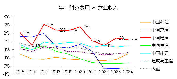 财务费用:2025年前三季,中国电建的财务费用为77.81亿元,同比减少2.49%,与营业收入的比例为1.77%,同比下降0.1个百分点;2015-2024年(十年),此项合计为741.87亿元,平均比例为1.79%,比建筑与工程行业的均值高0.93个百分点,长期呈下降趋势。