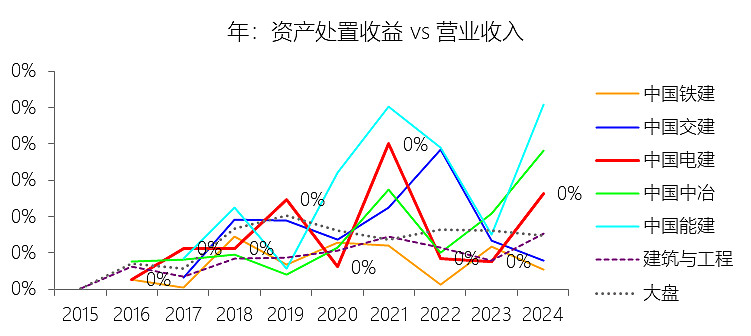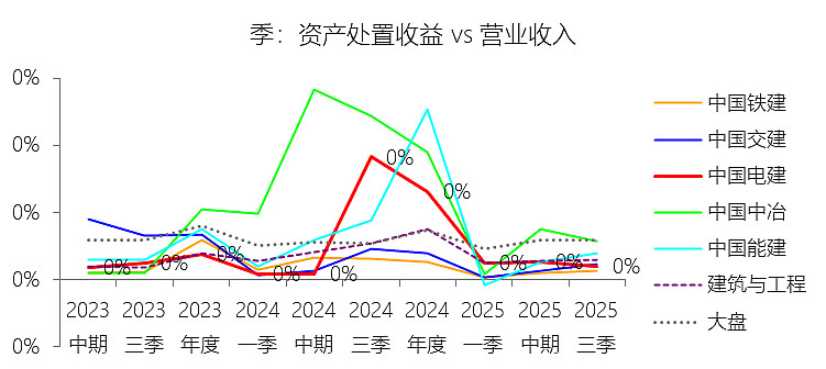 资产处置收益:2025年前三季,中国电建的资产处置收益为0.90亿元,同比减少88.47%,与营业收入的比例为0.02%,同比下降0.16个百分点;2015-2024年(十年),此项合计为33.46亿元,平均比例为0.08%,比建筑与工程行业的均值高0.03个百分点,长期呈上升趋势。比例短期下降主要由于:根据2025年第三季度报告,公司资产处置收益由去年同期的7.79亿元骤减至0.90亿元,这主要是由于本报告期内公司主动放缓了非核心业务及低效资产的剥离节奏,缺乏类似于去年同期的大额资产处置溢价项目入账;同时,在宏观经济及基建行业下行压力下,存量资产的处置进度和变现估值受到市场环境制约,导致该项收益在营收中的占比大幅缩水。比例长期上升主要由于:在2015至2024年的十年周期内,公司坚定执行“投建营一体化”转型及“瘦身健体”战略,特别是2022年通过资产置换剥离了大规模房地产业务,并在后续年度持续清退非主业、亏损及低效资产,这种战略性的资产结构调整释放了显著的处置增值,推动了该项指标比例的长期趋势性走高。比例高于建筑与工程行业的均值主要由于:中国电建拥有极高比例的能源电力特许经营及不动产储备资产,其资产属性相比纯施工类企业具有更强的增值潜力和处置灵活性;此外,公司在深化国企改革过程中,通过剥离房地产板块、盘活存量水电及新能源资产等一系列大规模资产重组动作,使得其资产处置收益的释放频次和规模均领先于业务模式相对单一、资产周转率稳定的传统建筑承包企业。