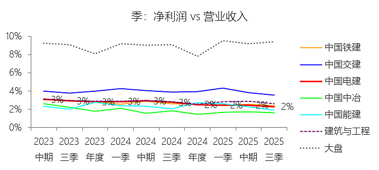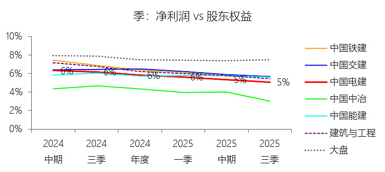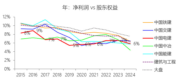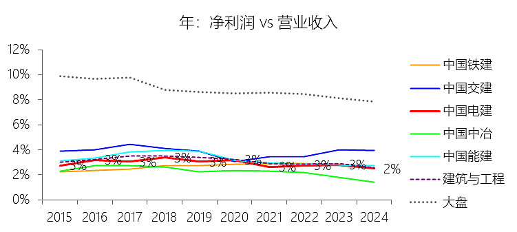 净利率:2025年前三季,中国电建的净利润为101.12亿元,同比减少14.26%,与营业收入的比例为2.30%(净利率),同比下降0.46个百分点;2015-2024年(十年),此项合计为1182.80亿元,平均比例为2.86%,比建筑与工程行业的均值低0.18个百分点,长期呈下降趋势。比例短期下降主要由于:根据2025年第三季度报告,公司营业成本增速(4.15%)超过了营业收入增速(3.05%),导致毛利空间被直接压缩;同时,资产处置收益较去年同期大幅减少约6.9亿元,且所得税费用在利润总额下降的情况下不降反升,进一步摊薄了净利率;比例长期下降主要由于:随着国内建筑市场进入存量博弈阶段,行业内卷式竞争愈发激烈,加之原材料价格及人力成本呈趋势性上涨,持续侵蚀了企业的利润边际;此外,公司近年来大力推行“投建营”一体化模式,虽然带动了收入规模,但前期高额的融资利息支出及资金沉淀也对长期利润率构成了压制;比例低于建筑与工程行业的均值主要由于:中国电建作为典型的重资产央企,其持有的水利、电力等基础设施资产在建设及运营初期面临巨大的折旧成本和财务费用负担;同时,在跨领域扩张至一般建筑业务过程中,受限于该领域较低的行业准入门槛和激烈的价格竞争,其盈利水平受整体基建行业低毛利特征的拖累更为明显。