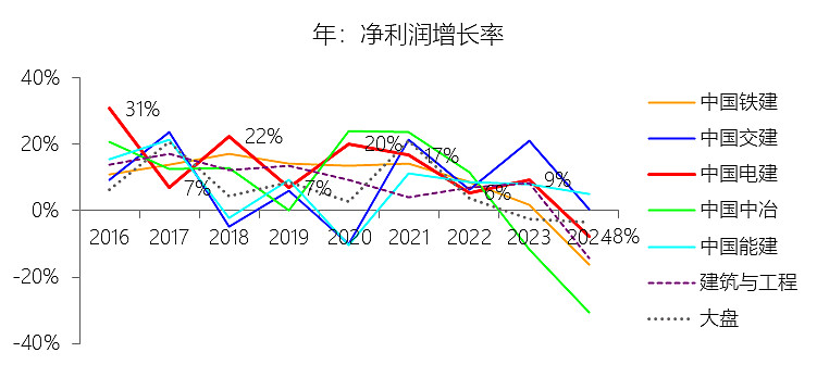 营业收入增长率:2025年前三季,中国电建的营业收入为4391.06亿元,同比增长3.05%,增速同比上升1.75个百分点;2015-2024年(九年)增长200.44%,年复合增长13%,比建筑与工程行业的复合增速高3.53个百分点,长期呈下降趋势。增速短期上升主要由于:公司在2025年前三季度稳步推进重大项目履约,特别是在“双碳”目标背景下,新能源(如风电、光伏)及综合智慧能源业务规模持续扩张,且海外业务随“一带一路”倡议的深化而稳健复苏,有效对冲了传统建筑行业的下行压力。增速长期下降主要由于:随着公司营业收入规模基数不断扩大,维持两位数以上高增长的难度增加;同时,受国内基础设施投资增速放缓、地方政府债务压力以及建筑行业内卷竞争影响,产值规模增速逐步回归中速增长区间,加之公司为优化资产结构,在2022年前后置出了房地产开发等非核心及低毛利业务,导致收入同比口径发生变动。增速高于建筑与工程行业的复合增速主要由于:中国电建深耕水利水电、新能源及抽水蓄能等高技术壁垒、高附加值的细分领域,拥有从规划设计到施工运营的全产业链优势,在新型电力系统建设和全球能源结构转型中占据了比传统民用基建行业更具成长潜力的战略性新兴赛道。
